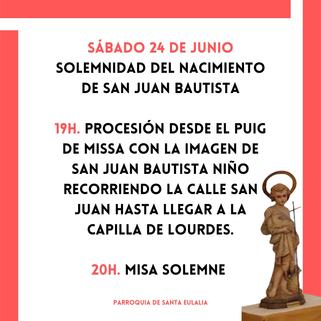 Sábado 24 de junio de 2023, a las 19h desde el Puig de Missa de Santa Eulària des Riu, procesión con la imagen de San Juan hasta la Capilla de Lourdes donde se celebrará la misa.